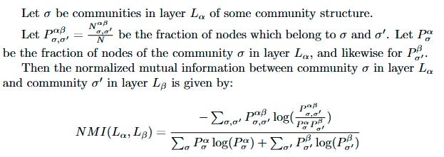 What this convoluted equation measures is basically how much expected divergence there is between the two layers if we measure them together and if we measure them independently, divided by the total average of information of the two distinct layers. If there’s a large divergence given the total average of information, it means that the two layers in question are effectively more complex taken together than they are independently — simply put, their contribution is not reducible to their independent layers. This gives us an idea of how we might measure the contribution of a community to mutual information sharing between layers.
