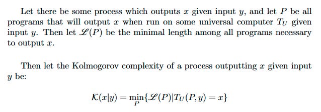 To put it into plain terms, the K of a process outputting x is just that which we need to accomplish the output x of that process. The definition is open-ended enough to allow for an intuitive notion of complexity. For example, the string ‘ababababababab’ is less complex than the string ‘3194u019jw0wj’ because the former can be realized by the process ‘ab x 7’ while the latter string cannot. Therefore, K(‘ababababababab’) < K(‘3194u019jw0wj’).