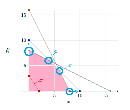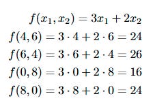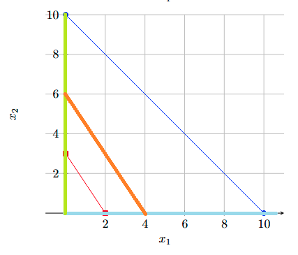 Given our constraints, the area in pink represents the only possible choices of x1 and x2. The blue circles represent the edges (corner points) which are the best optimal choices: these are (4,6), (6,4), (0,8), and (8,0). However, only the edge (6,4) points in the same direction as the normal of the red line — that means it must be the optimal edge given our valuations V1 and V2. To verify that is simple: plug in all the edges in our original equation: