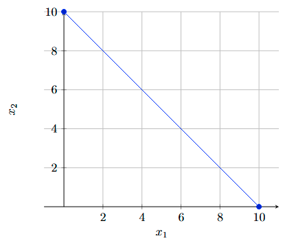 Now that we have our small economic model, we can solve problems by plugging in the relevant numbers and then maximizing x1 and x2. To start, let’s say we have a land of 10 hectares. We then figure that neither crop can be planted on more than 10 hectares, and that they stand in proportion such that we have 5 hectares of corn if we have 5 hectares of wheat. This is a linear relationship, and we can map that out as such: