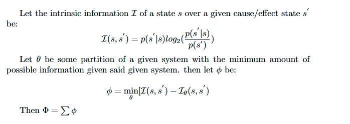 Okay, but precisely the complexity of what are we trying to maximize? Apolito appeals to the notion of integrated information to make a case for form of “collectivity” which is not reducible down to individual agents. When we maximize the integrated information of a network, we maximize the informational complexity that exists by virtue of the causal dependencies between nodes in a system. To go into detail could be a long textbook on its own, but the notion of how such information complexity may be achieved is analogous to how complexity functions in the brain. For example, visual sight in the mammalian brain functions by visual input from the optic nerve being integrated and distributed by the primary visual cortex to the rest of the brain. This sort of complexity is not reducible down to individual neurons: it is in fact a systems-level phenomenon. The measure of total irreducible complexity in integrated information theory is denoted by Φ. Φ is defined as the summation of all subunits that locally maximize their φ, which is defined as the amount of information intrinsic in a change from one state to another:
