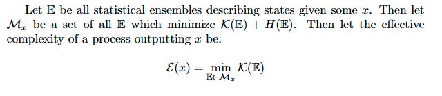 Simply put, we choose the ‘statistical ensembles10’ which have minimal entropy and complexity given some output x, and compute the complexity of the process needed to realize that output. With this definition, we’ve avoided the problem of randomness being definitionally more complex than non-randomness as we reject those statistical ensembles which give unpredictable and random results. By comparing the effective complexity of one process to another given some change of state and picking the most discriminating and parsimonious computation, we have a notion of informational complexity insensitive to random signals.