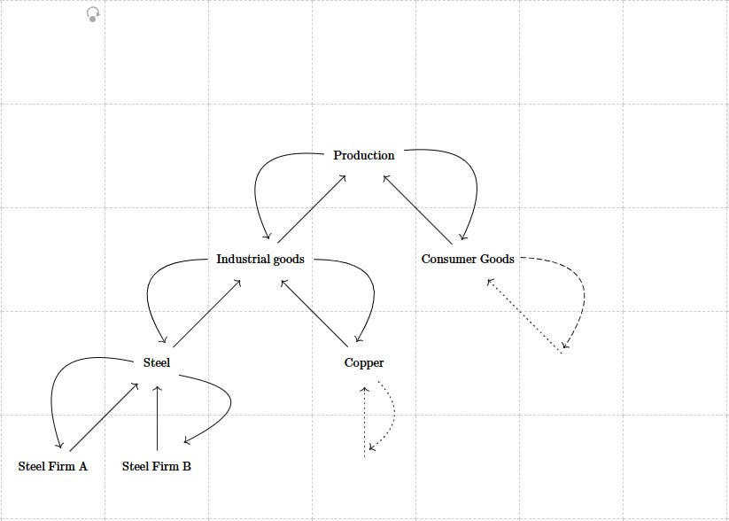 I’ll first discuss the upward arrows. “Steel Firm A” provides a signal to “Steel” about production: both “Steel Firm A” and “Steel Firm B” can together provide 1 unit of steel to the economy. Based on the information provided by “Steel Firm A” and “Steel Firm B,” and all other steel firms, “Steel” reports to “Industrial goods” that “Steel” can provide 1 unit of steel. “Industrial goods” collates that information along with the information of all other industrial sectors such as “Copper.” That information is passed onto “Production,” which collates that information along with the information it gets from all other sectors of production. This information provides a picture of the ‘state’ of the economy and its capabilities for production.