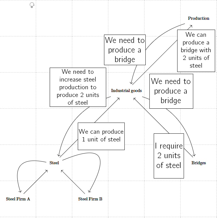 In this example, we see that the “Production” node provides ‘demand information’ to the “Industrial goods” node: there is demand to produce a bridge. The “Industrial goods” node responds to the feedback by issuing that ‘demand information’ to the “Bridges” node, which responds with the ‘demand information’ that it requires 2 units of steel. Based on the ‘supply information’ given by the “Steel” node, the “Industrial goods” node responds to the ‘demand information’ given by the “Bridges” node by issuing ‘demand information’ to the “Steel” node: we need to increase production and produce 2 units of steel. In response to the ‘demand information,’ ‘supply information’ is provided to the “Production” node: 1 bridge can be produced with 2 units of steel.