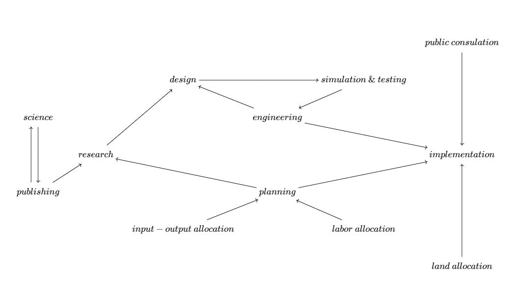 Cybernetic communism would work in a similar fashion. Rather than a centralized body, each node in a network would ‘send’ a signal forward to a higher node which would be responsible for providing feedback. This might be best demonstrated by the following model for production:
