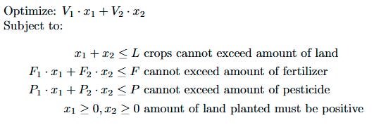 Let’s say a firm has a piece of land of size L, planted with either corn or wheat. The firm has F kilograms of fertilizer, and P kilograms of pesticide. Every hectare of corn requires F1 kilograms of fertilizer and P1 kilograms of pesticide, and every hectare of wheat requires F2 kilograms of fertilizer and P2 kilograms of pesticide. Let’s take V1 to be some valuation of corn, and V2 to be some valuation of wheat per hectare. Let x1 be the area of land planted with corn, and x2 the area of land planted with wheat. Given the valuations (V1 and V2) you give to corn and wheat, you can maximize your total value by choosing the optimal choices for x1 and x2.